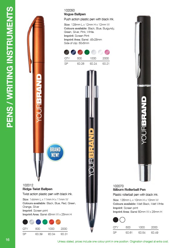 PENS / WRITING INSTRUMENTS Unless stated, prices include one colour print in one position. Origination charged at extra cost. 16