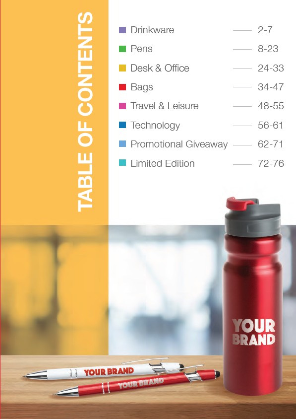 TABLE OF CONTENTS Drinkware Pens Bags Travel & Leisure Technology Promotional Giveaway Limited Edition 2-7 8-23 24-33 34-47 48-55 56-61 62-71 72-76