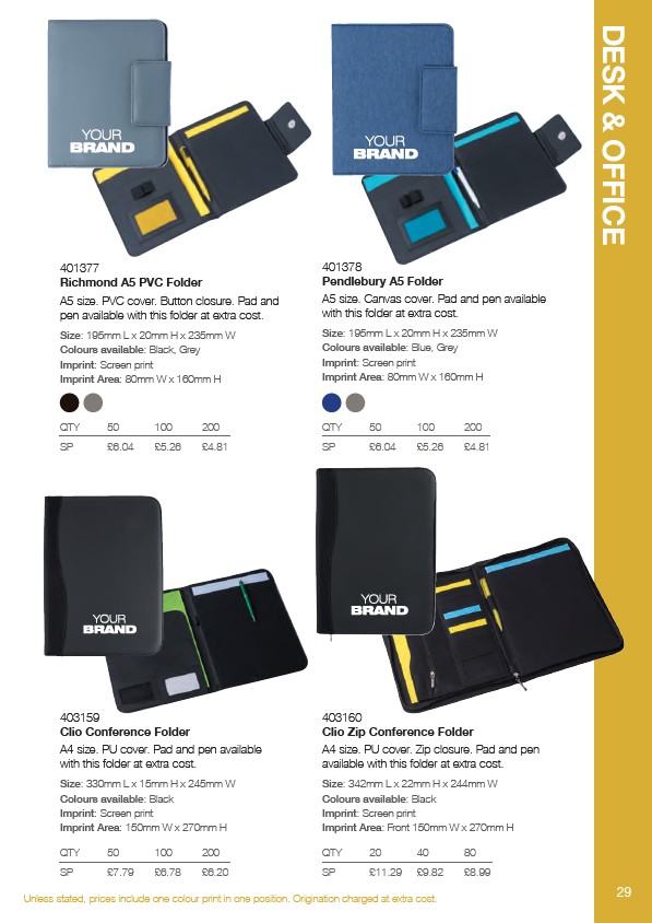 Unless stated, prices include one colour print in one position. Origination charged at extra cost. 29