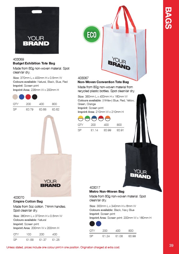 Unless stated, prices include one colour print in one position. Origination charged at extra cost. 39