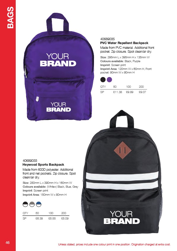 Unless stated, prices include one colour print in one position. Origination charged at extra cost.