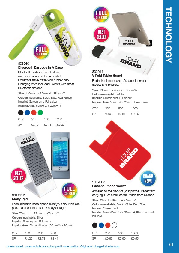 Unless stated, prices include one colour print in one position. Origination charged at extra cost. 61