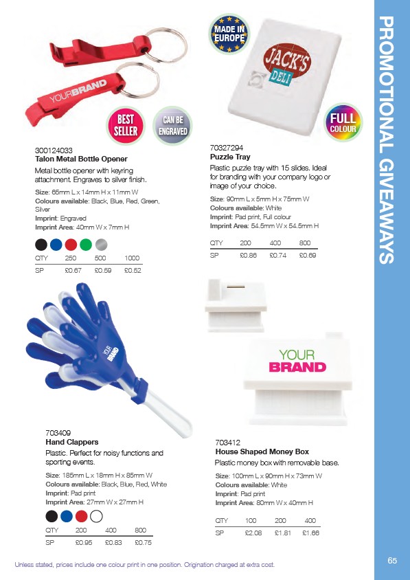 Unless stated, prices include one colour print in one position. Origination charged at extra cost. 65