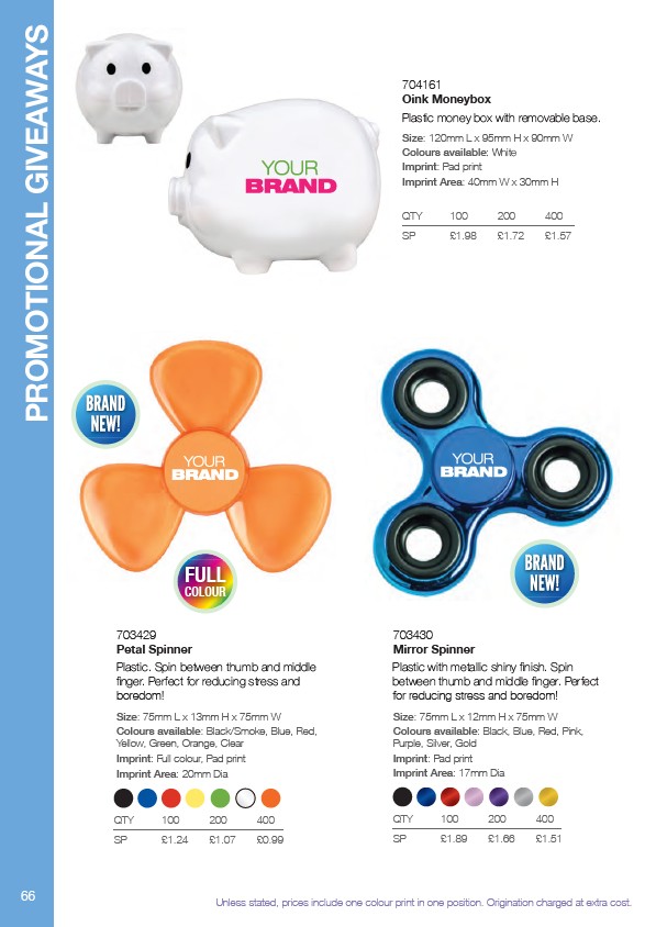 PROMOTIONAL GIVEAWAYS Unless stated, prices include one colour print in one position. Origination charged at extra cost. 66