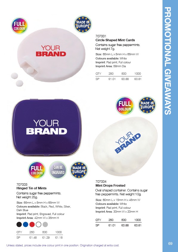 Unless stated, prices include one colour print in one position. Origination charged at extra cost. 69