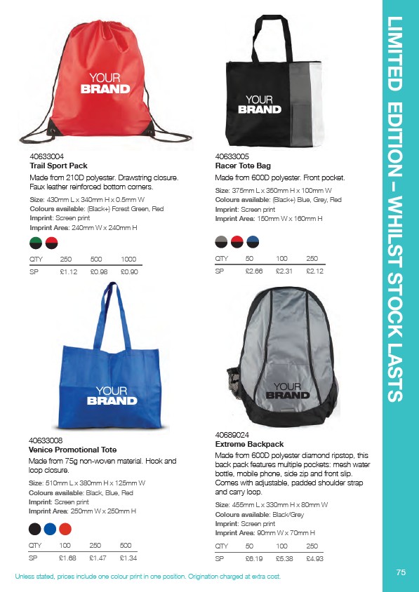 Unless stated, prices include one colour print in one position. Origination charged at extra cost. 75