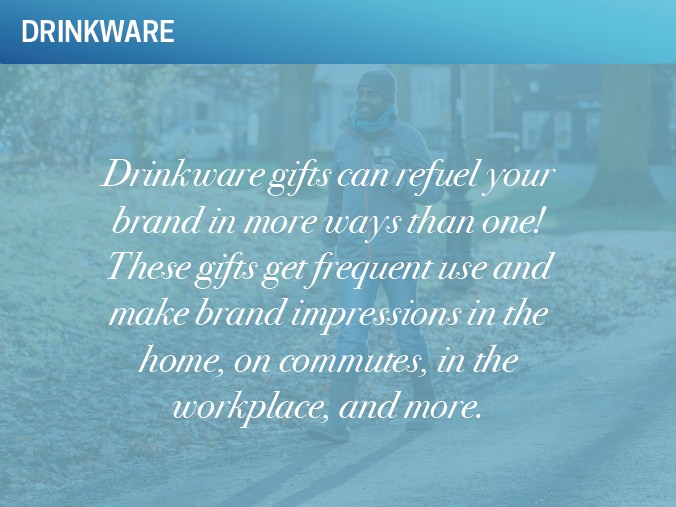 DRINKWARE Drinkware gifts can refuel your brand in more ways than one! These gifts get frequent use and make brand impressions in the home, on commutes, in the workplace, and more.