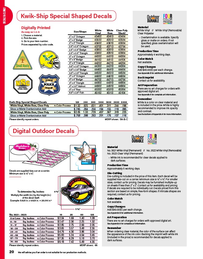 sizes, contact us for pricing. Decals may be furnished multiple-up