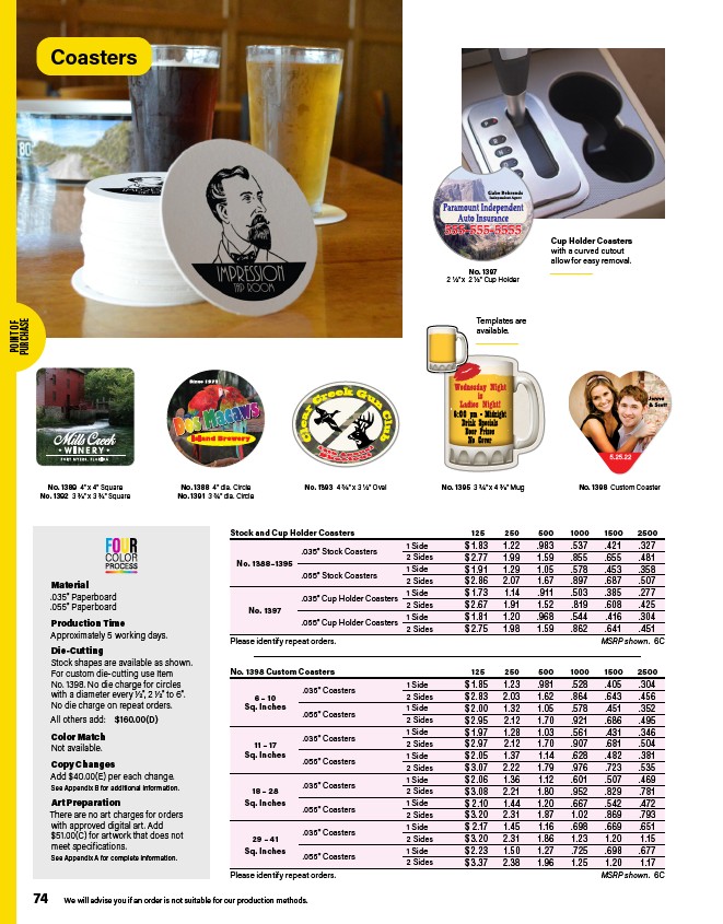 No. 1398 Custom Coasters 125 250 500 1000 1500 2500