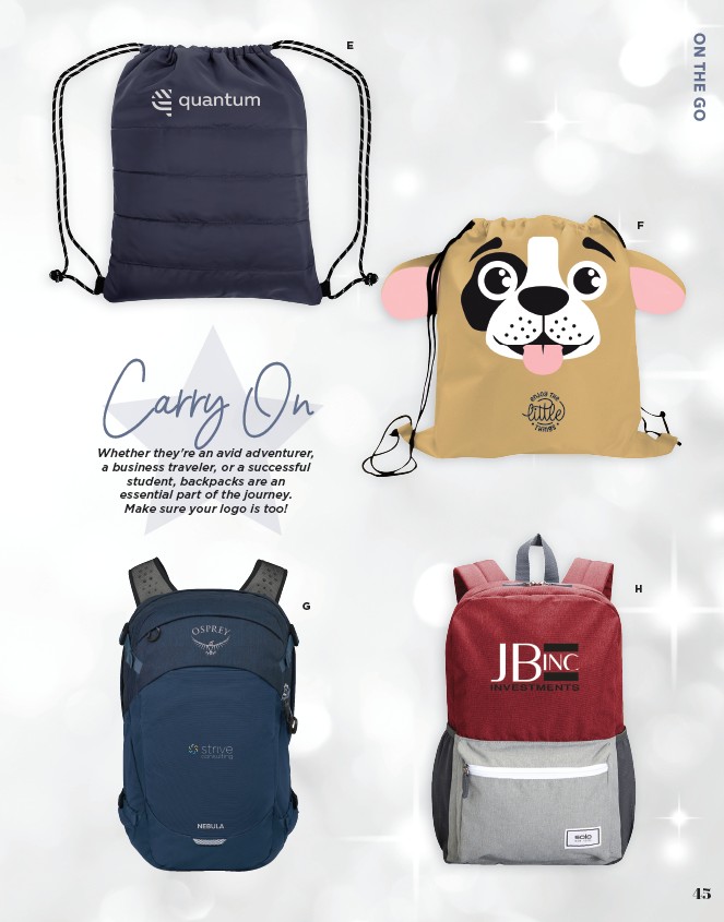 45 E G F H Carry On Whether they're an avid adventurer, a business traveler, or a successful student, backpacks are an essential part of the journey. Make sure your logo is too! On The Go