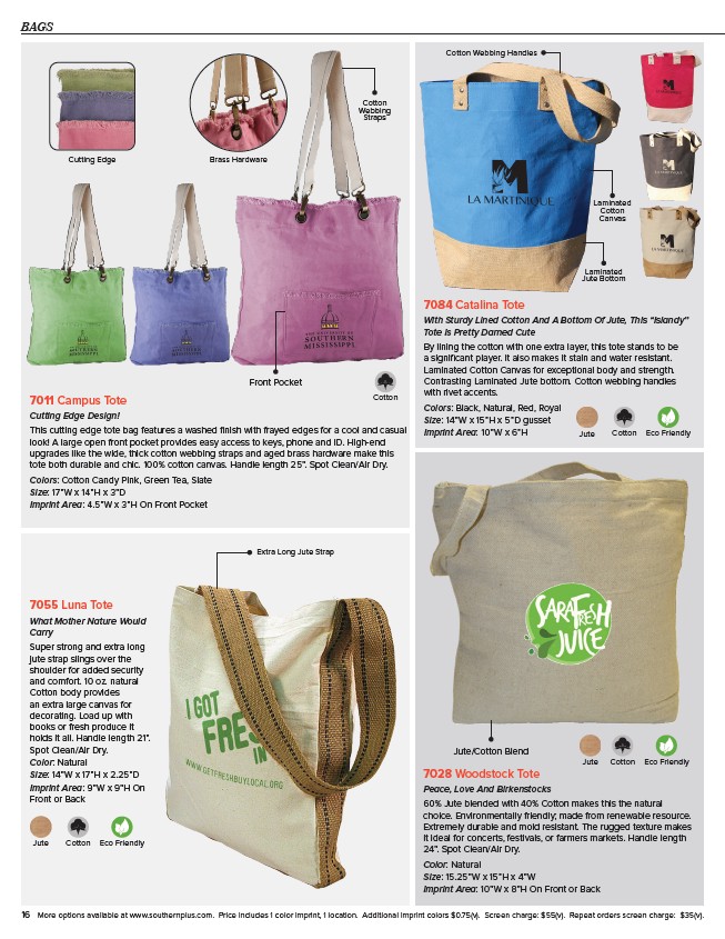 16 More options available at www.southernplus.com. Price includes 1 color imprint, 1 location. Additional imprint colors $0.75(v). Screen charge: $55(v). Repeat orders screen charge: $35(v).