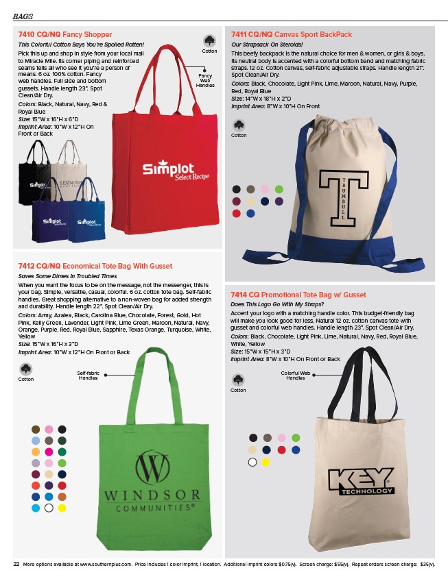 22 More options available at www.southernplus.com. Price includes 1 color imprint, 1 location. Additional imprint colors $0.75(v). Screen charge: $55(v). Repeat orders screen charge: $35(v).