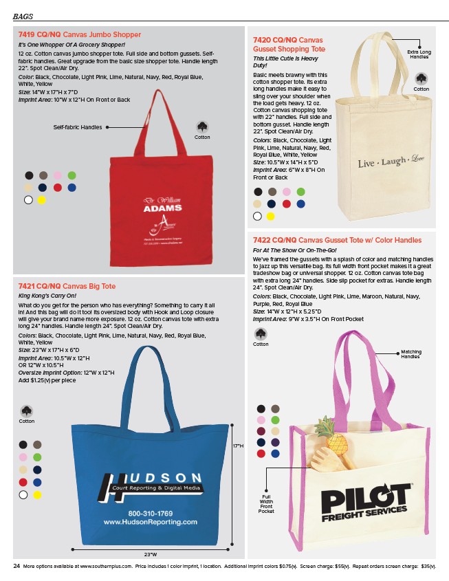 24 More options available at www.southernplus.com. Price includes 1 color imprint, 1 location. Additional imprint colors $0.75(v). Screen charge: $55(v). Repeat orders screen charge: $35(v).