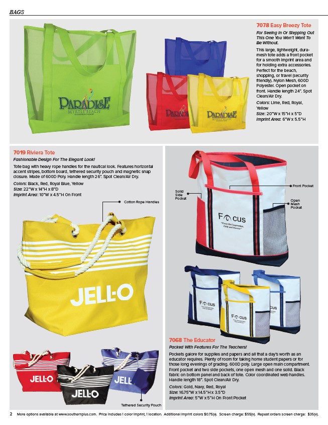 2 More options available at www.southernplus.com. Price includes 1 color imprint, 1 location. Additional imprint colors $0.75(v). Screen charge: $55(v). Repeat orders screen charge: $35(v).