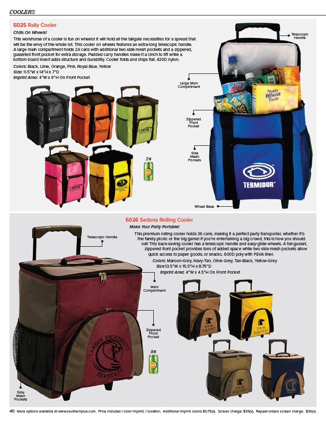 40 More options available at www.southernplus.com. Price includes 1 color imprint, 1 location. Additional imprint colors $0.75(v). Screen charge: $55(v). Repeat orders screen charge: $35(v).