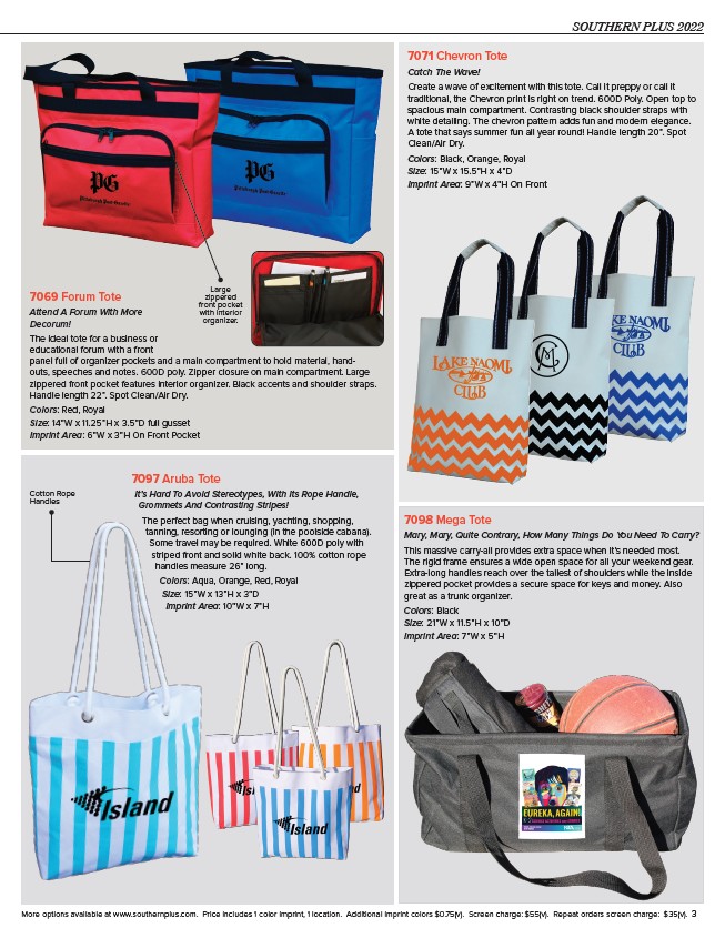 More options available at www.southernplus.com. Price includes 1 color imprint, 1 location. Additional imprint colors $0.75(v). Screen charge: $55(v). Repeat orders screen charge: $35(v). 3