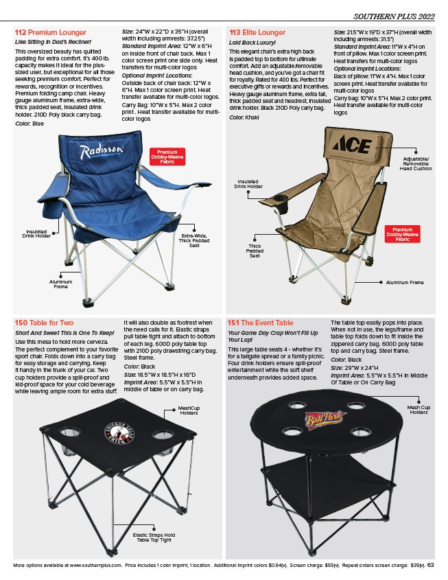 More options available at www.southernplus.com. Price includes 1 color imprint, 1 location. Additional imprint colors $0.94(v). Screen charge: $55(v). Repeat orders screen charge: $35(v). 63