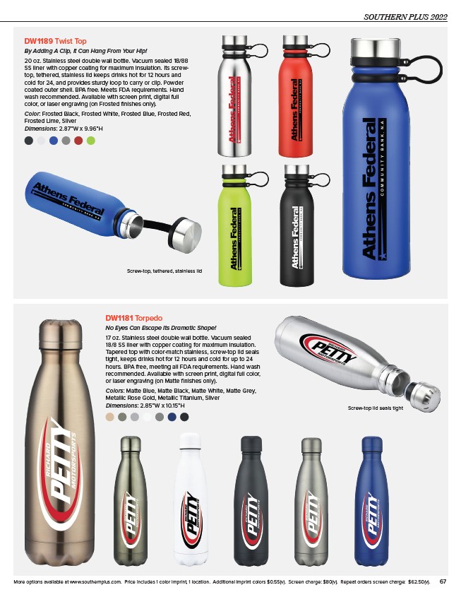 More options available at www.southernplus.com. Price includes 1 color imprint, 1 location. Additional imprint colors $0.55(v). Screen charge: $80(v). Repeat orders screen charge: $62.50(v). 67