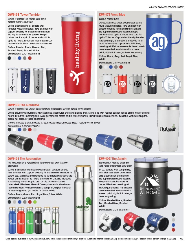 More options available at www.southernplus.com. Price includes 1 color imprint, 1 location. Additional imprint colors $0.55(v). Screen charge: $80(v). Repeat orders screen charge: $62.50(v). 69