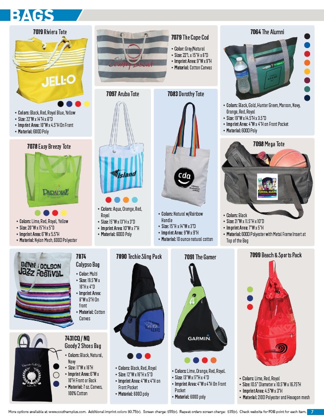 More options available at www.southernplus.com. Additional imprint colors $0.75(v). Screen charge: $55(v). Repeat orders screen charge: $35(v). Check website for FOB point for each item. 7
