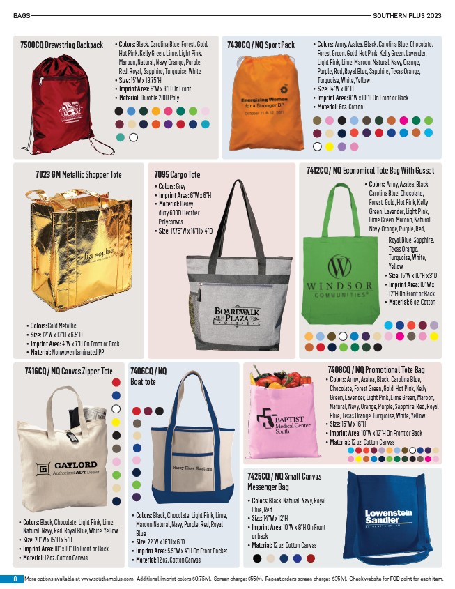 8 More options available at www.southernplus.com. Additional imprint colors $0.75(v). Screen charge: $55(v). Repeat orders screen charge: $35(v). Check website for FOB point for each item.