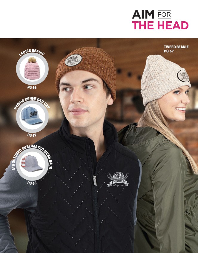 LADIES BEANIE PG 66 HYBRID DENIM DAD CAP PG 67 STRUCTURED SUBLIMATED MESH BACK PG 66 AIM FOR THE HEAD TWEED BEANIE PG 67